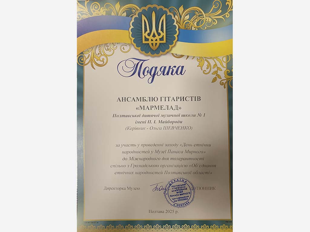 До Міжнародного дня толерантності спільно з Громадською організацією «Обʼєднання етнічних народностей Полтавської області» Ансамбль гітаристів Мармелад Дігтяр Владислав Викладач Ольга Шевченко