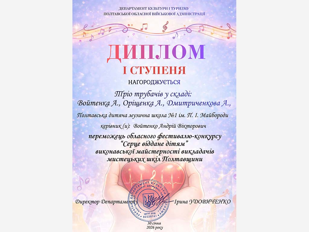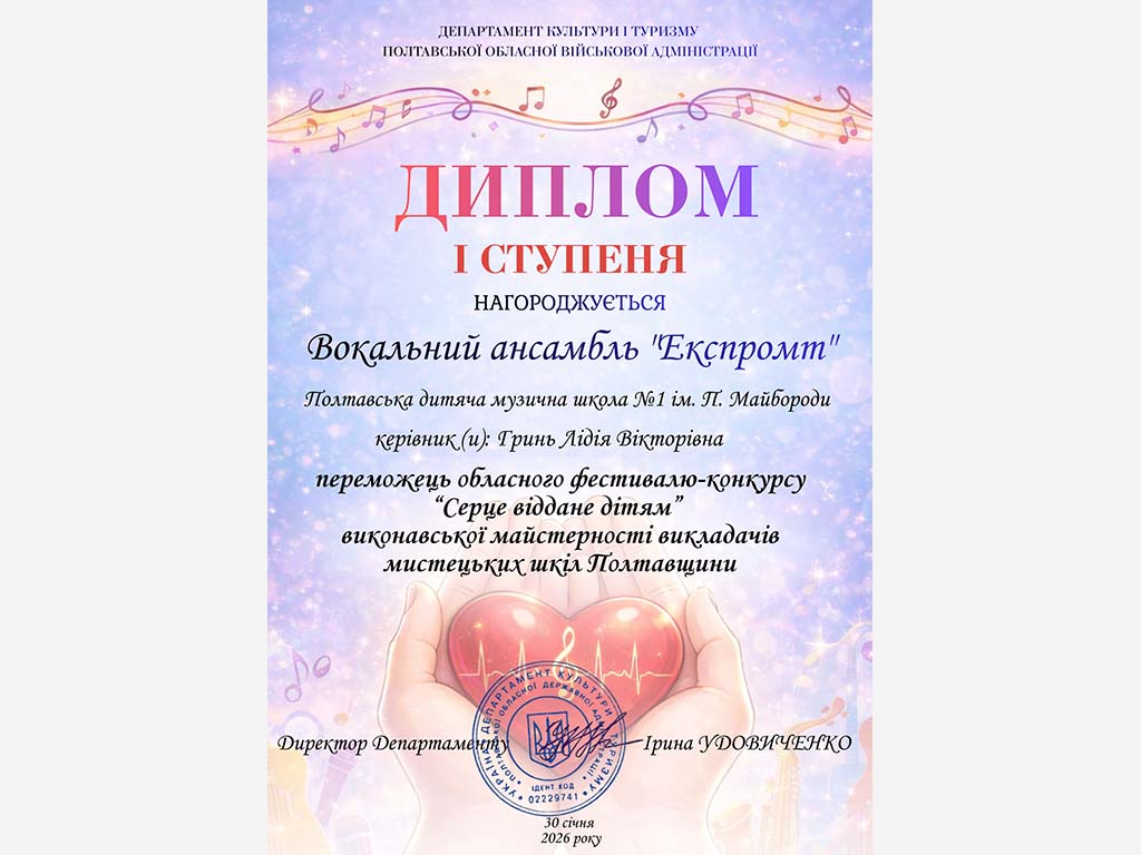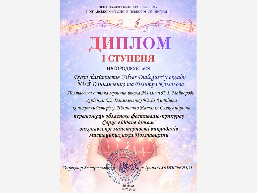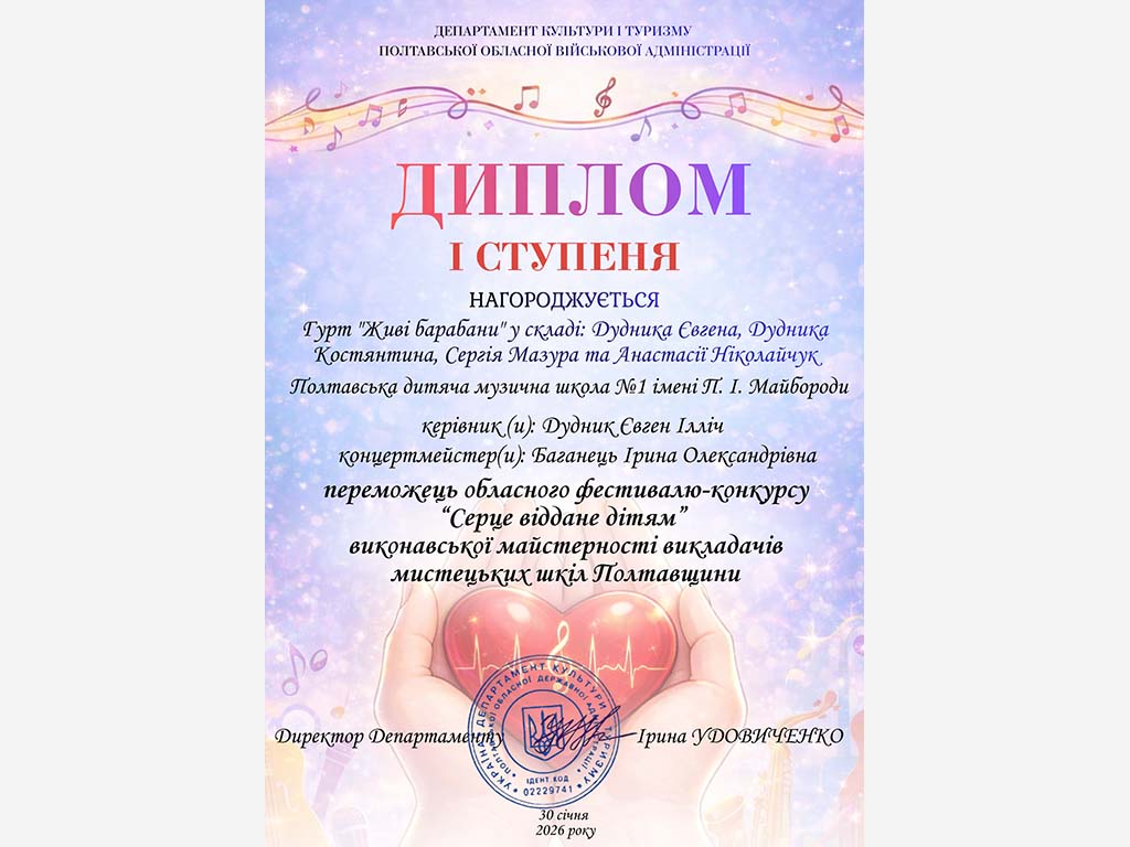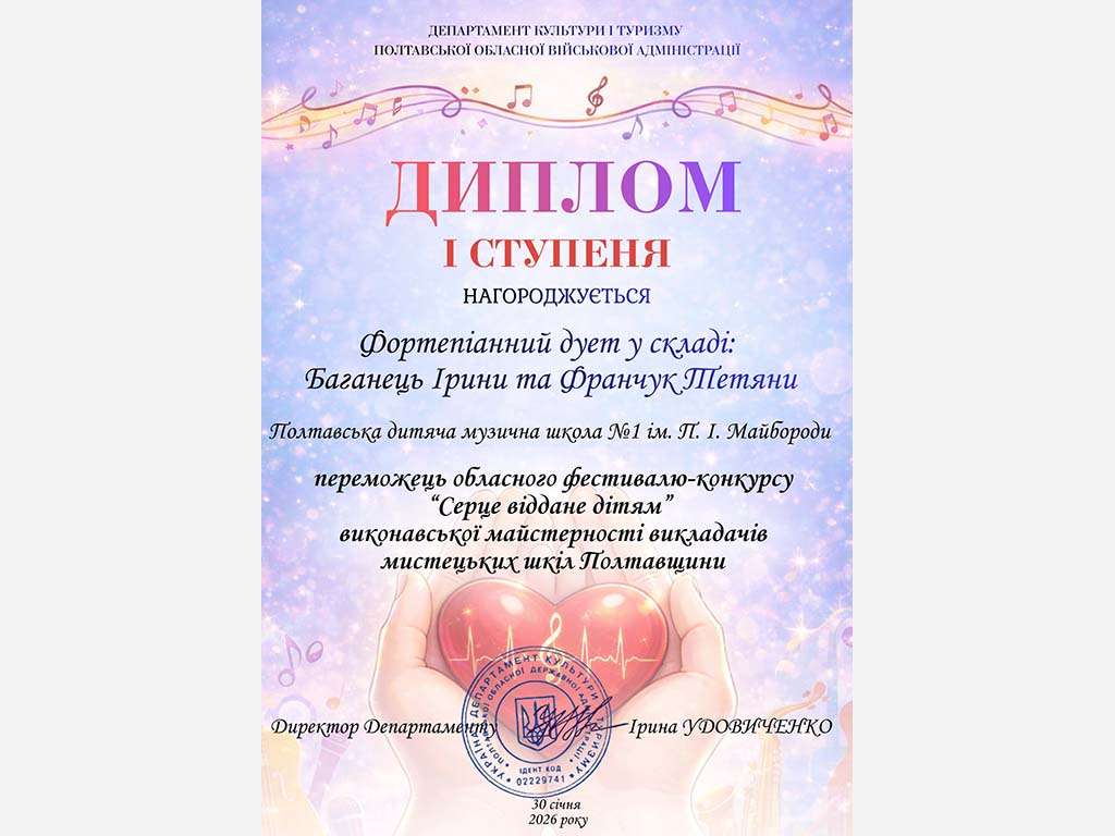 Вітаємо викладачів ДШ№1 з перемогою в фестивалі-конкурсі виконавської майстерності викладачів мистецьких шкіл Полтавщини «Серце віддане дітям».