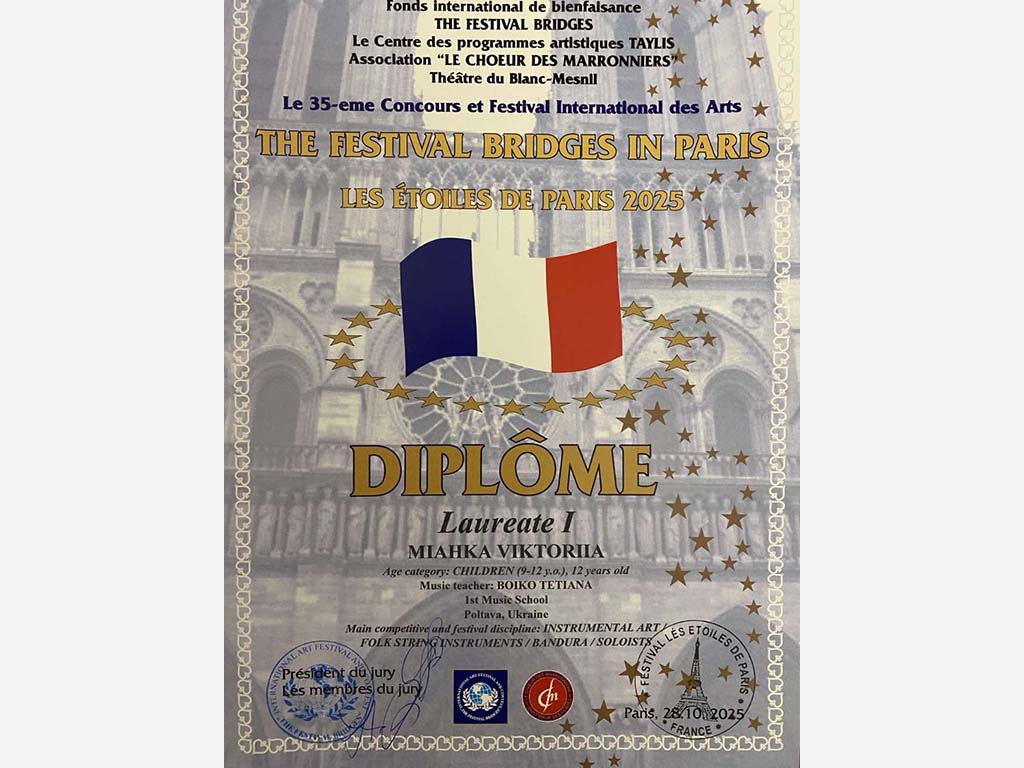 Вітаємо ученицю нашої школи по класу бандура Мягка Вікторія - 1 місце. Викладач Бойко Тетяна Юріївна 35 міжнародний конкурс та фестиваль фолькльору, танцю і музики «Зірки Парижу» THE FESTIVAL BRIDGES IN PARIS